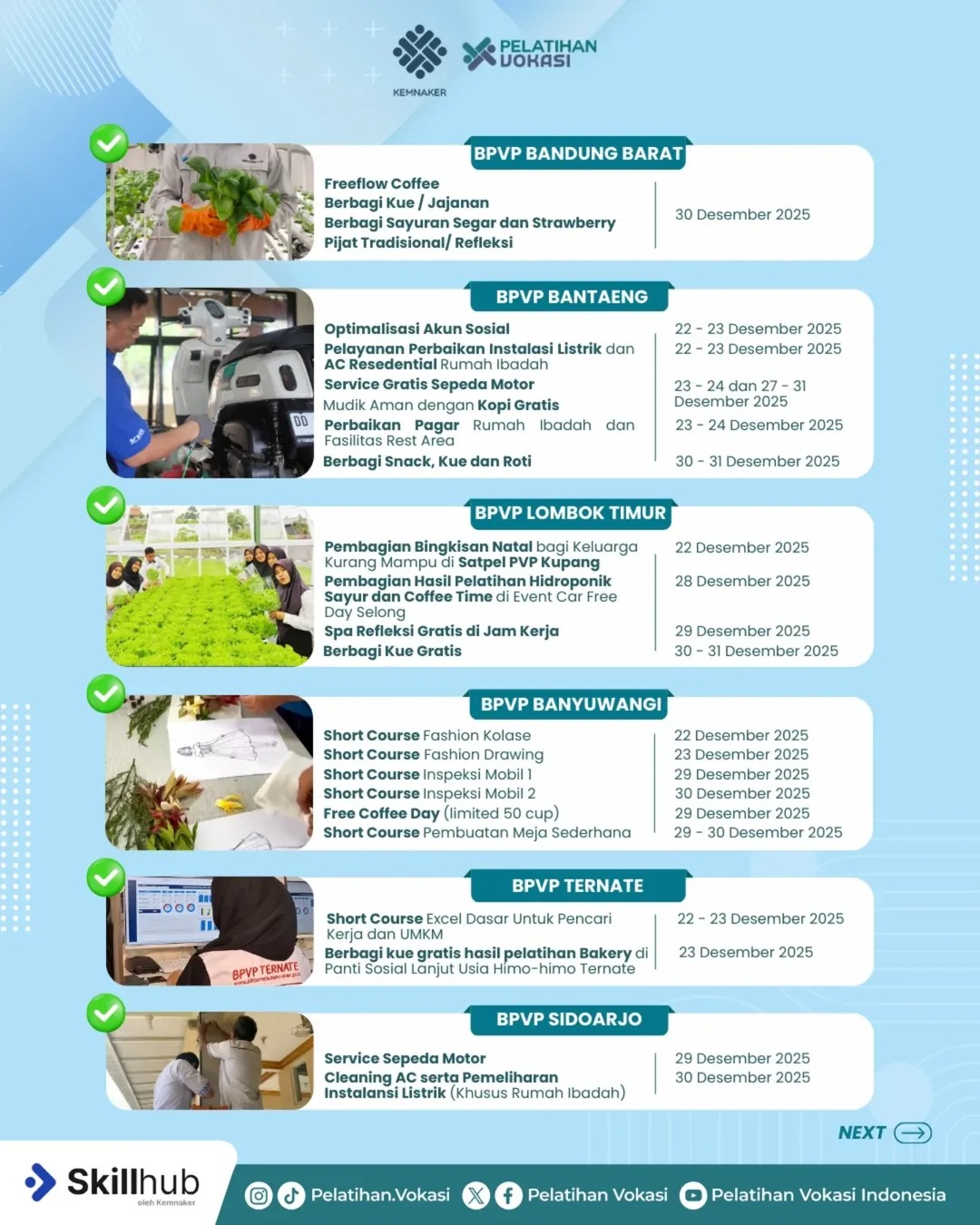 Libur Nataru nggak cuma soal liburan! 🎄✨ Di BPVP, libur jadi makin bermanfaat 💪 Mulai dari servis kendaraan, AC, dan laptop GRATIS, donor darah & cek kesehatan GRATIS, sampai pelatihan vokasi GRATIS buat upgrade skill. Gaskeun ke BPVP terdekat! 🚀