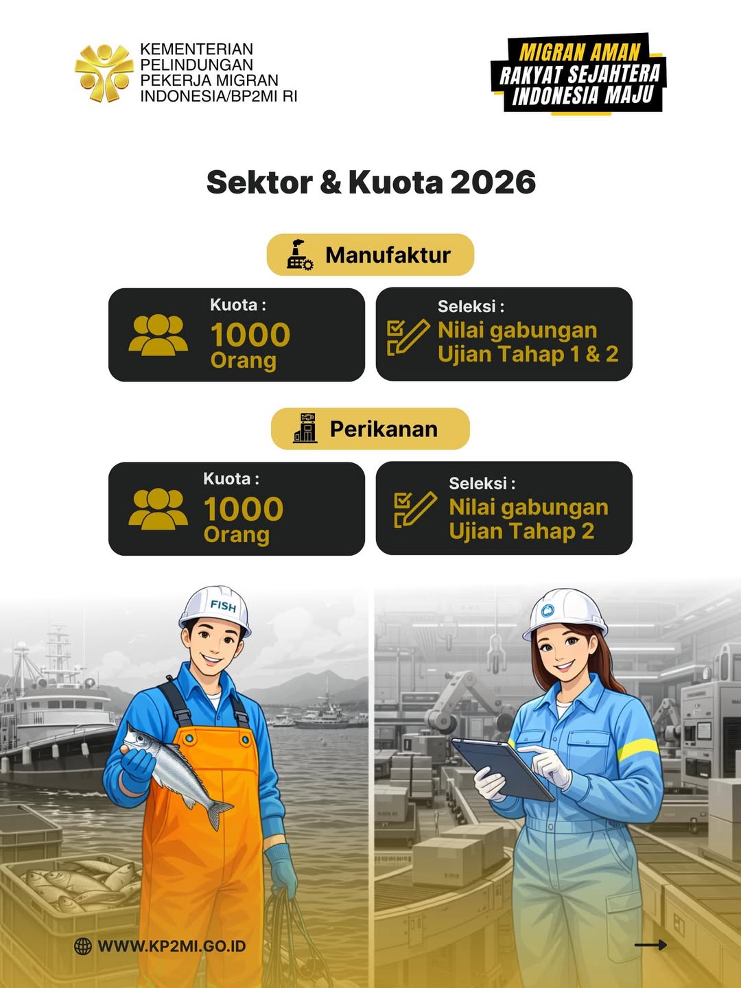 Pendaftaran dibuka untuk sektor Manufaktur dan Perikanan. Detail jumlah kuota dan jadwal pendaftaran tercantum lengkap pada visual ya sobat.