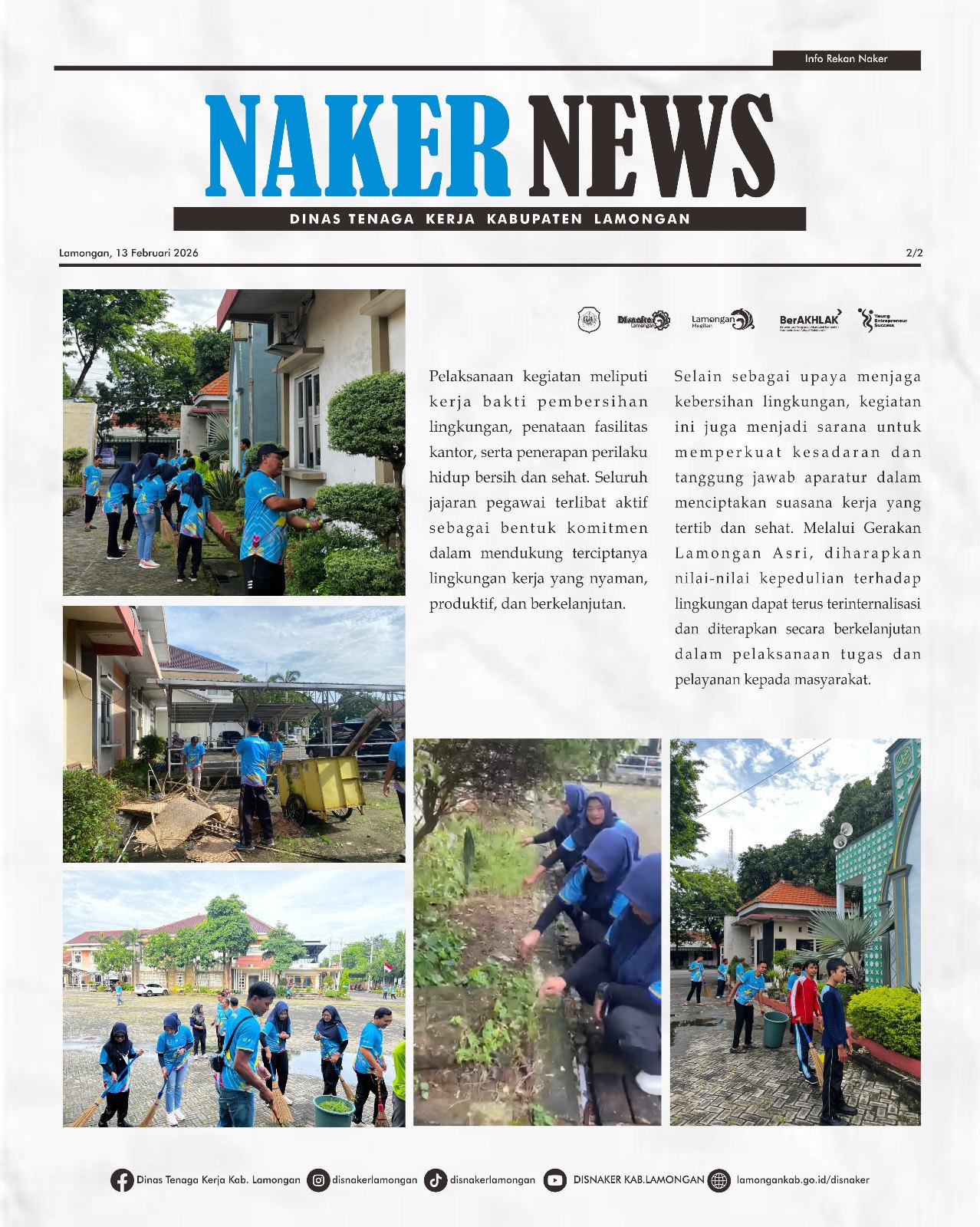Lamongan, 13 Februari 2026 - Sebagai bentuk komitmen dalam mendukung lingkungan yang aman, sehat, resik, dan indah, Dinas Tenaga Kerja Kabupaten Lamongan turut berpartisipasi dalam rangkaian kegiatan Gerakan Lamongan Asri bersama seluruh perangkat daerah.