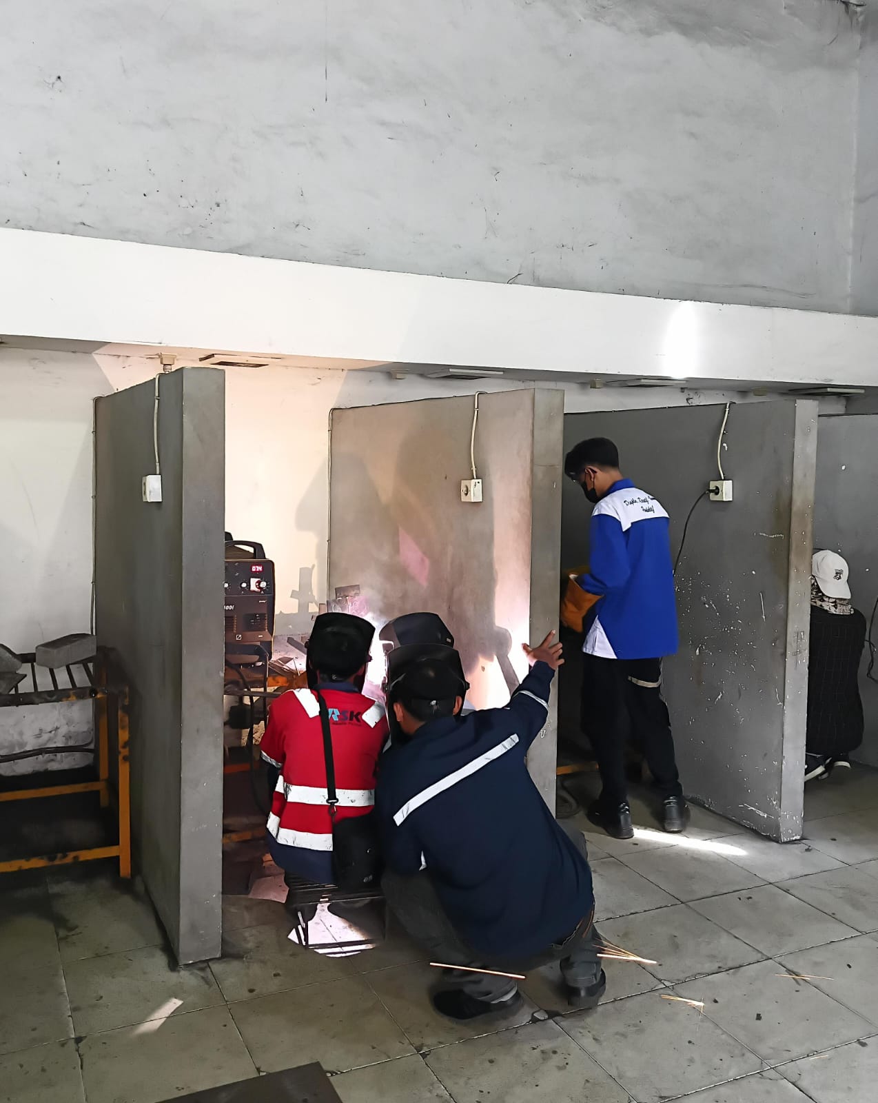 Setelah penyampaian materi, peserta juga diberikan kesempatan untuk praktik secara langsung di bawah bimbingan instruktur. Mereka tampak serius dan fokus dalam mencoba menyalakan busur listrik serta menyesuaikan pengaturan mesin las agar menghasilkan nyala yang stabil.